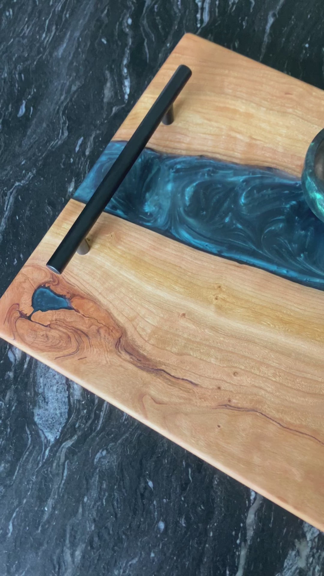 This set is made with natural wood and epoxy. The tray has matte black metal handles. Each piece is unique and one of a kind.