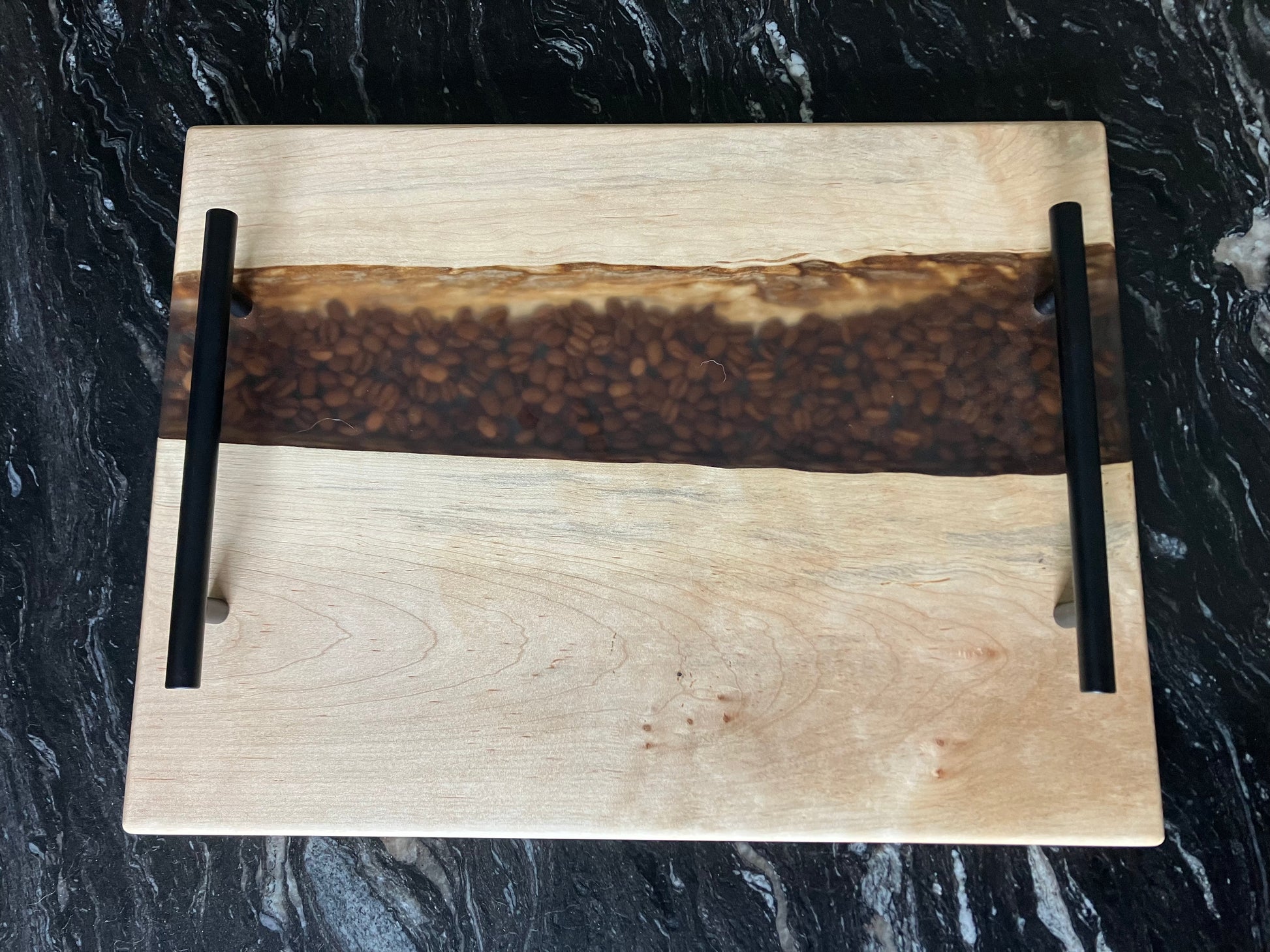 Our serving trays are a combination of beautiful wood with complementary epoxy. Each tray is about 12x16" and comes with matte black handles. Perfect for serving charcuterie or food of your choice! They can also be used as a beautiful addition to any room to display your jewelry, perfume, bathroom products, guest room items etc.