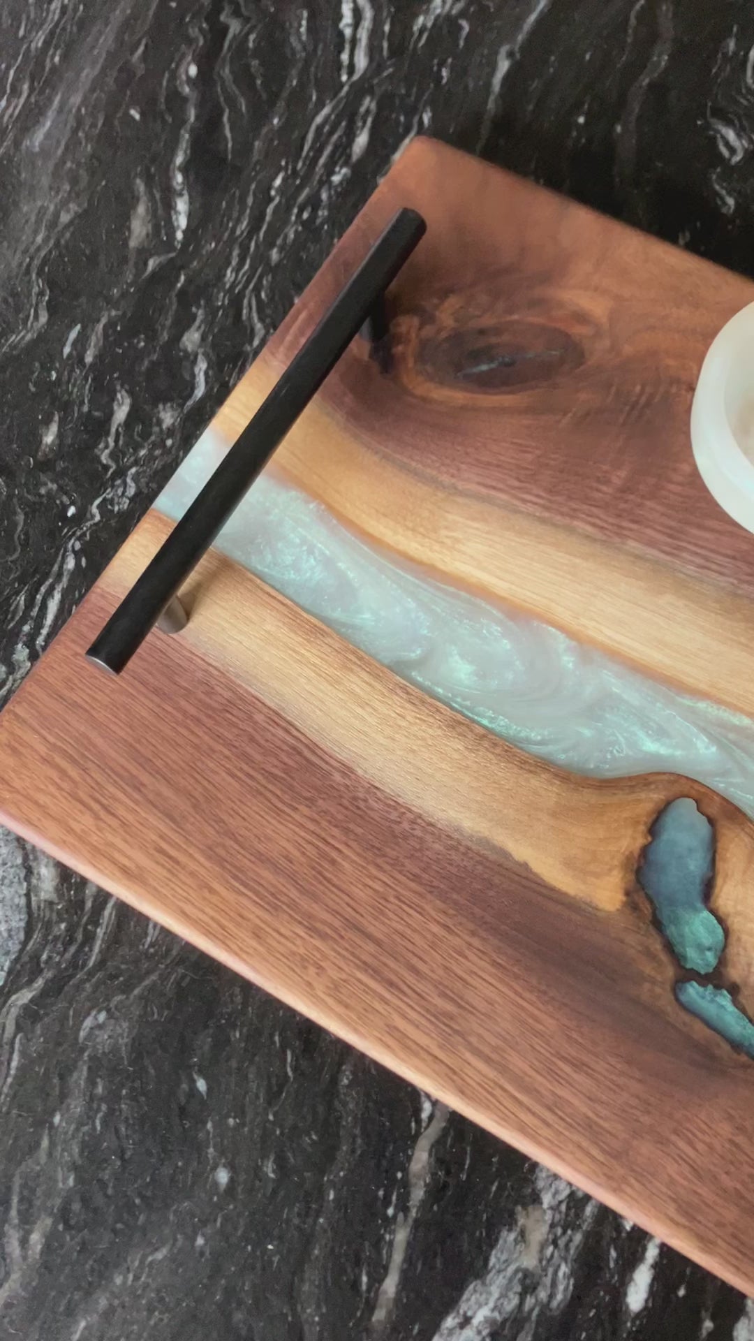 This set is made with natural wood and epoxy. The tray has matte black metal handles. Each piece is unique and one of a kind.
