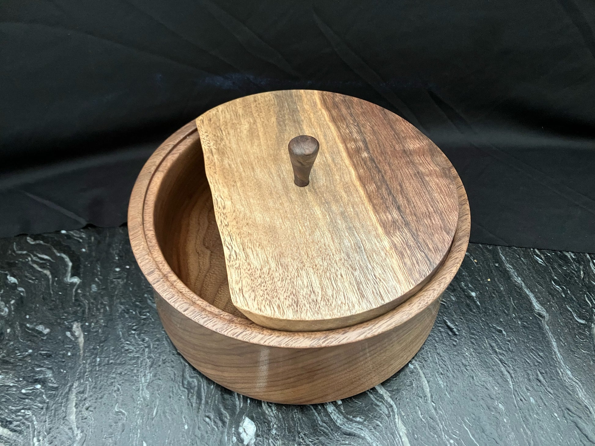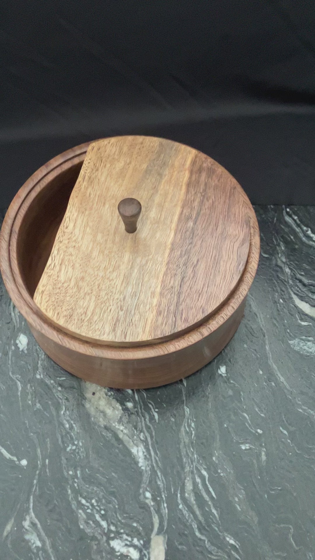 The boxes are hand turned on a lathe. This bowl is 8" in diameter and 4.5" tall, and comes with a lid. Each piece is unique and one of a kind.